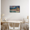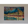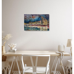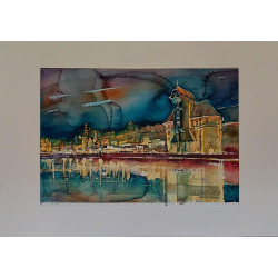 Ten zachwycający obraz autorstwa Andrzeja Pastewki ukazuje nocny pejzaż miasta z odbiciem w spokojnej tafli wody. W centrum kompozycji znajduje się monumentalna, zabytkowa budowla, której ciepłe, złote światło kontrastuje z chłodnymi, głębokimi barwami nocnego nieba. W tle widoczna jest panorama miasta, z migoczącymi światełkami i delikatnie zarysowanymi sylwetkami budynków. Technika akwareli, z charakterystycznymi przejściami kolorów i płynnością form, dodaje obrazowi lekkości i nastrojowości.