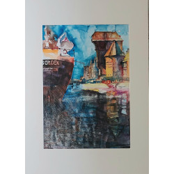 Zanurz się w fascynujący świat sztuki morskiej i architektonicznej. Ten obraz, wykonany techniką akwareli i gwaszu, przedstawia dwa ikoniczne obiekty polskiego wybrzeża: statek Sołdek oraz historyczny Żuraw w Gdańsku. Malarskie ujęcie uchwyca magię nadmorskiego krajobrazu, zestawiając surowość przemysłowej przeszłości z pięknem architektury.