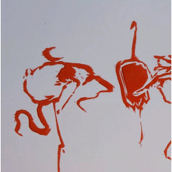 "Flamingi” to niepowtarzalny drzeworyt autorstwa Bosaka, przedstawiająca dynamiczną grupę flamingów w symbolicznej interakcji. Subtelność kompozycji uzyskano dzięki minimalistycznym konturom i wyrazistej czerwonej barwie, która podkreśla elegancję sylwetek ptaków. Dzieło nawiązuje do harmonii i współpracy, oddając ducha natury w sposób prosty, a zarazem wyrazisty.
