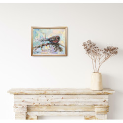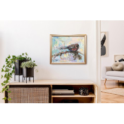 Obraz akrylowy na płycie o wymiarach 35x20 cm. Oprawiony przez Artystkę w elegancką, szeroką ramę w kolorze brązowym, ze złoceniem.