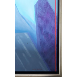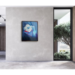 Praca oprawiona w prostą z dystansem do płótna ramę, o kolorze szampańskiego złota.