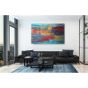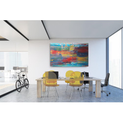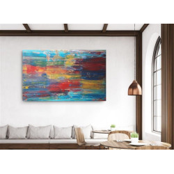 Nowoczesny obraz w stylu taszyzmu autorstwa Piotra Krajewskiego. Dynamiczna, abstrakcyjna kompozycja pełna ekspresyjnych pociągnięć pędzla i intensywnych barw, takich jak błękit, czerwień, żółć i złoto. Format 160x100 cm sprawia, że dzieło doskonale komponuje się w przestronnych wnętrzach, dodając im wyjątkowego charakteru. Idealny wybór dla miłośników sztuki nowoczesnej, zarówno do salonu, biura, jak i eleganckich przestrzeni komercyjnych