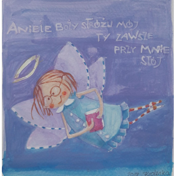 Anioł Stróż - bajkowy obrazek z modlitwą; idealny na prezent dla dziecka. Akryl na papierze o wymiarach 12x12 cm, z możliwością oprawienia w passe-partout i ramkę (w tym celu proszę o dodanie produktu "rama systemowa" do koszyka - dodatkowy koszt 50 zł).