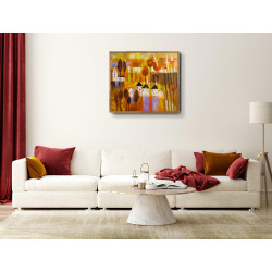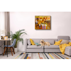 Praca oprawiona w prostą z dystansem do płótna ramę, o kolorze szampańskiego złota.