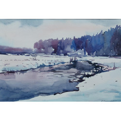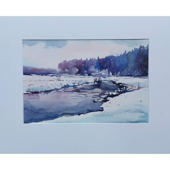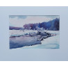 Obraz "ZIMOWY PEJZAŻ, GÓRNA SLUPIA" charakteryzuje się stonowanymi kolorami i dopracowanymi detalami. Każde pociągnięcie pędzla jest starannie wykonane, aby stworzyć organiczne i wciągające wrażenia. Akwarela utrzymana w pięknych zimowych barwach, ukazująca chwilę, pięknego zakątka Górnej Słupii w zimowy poranek.