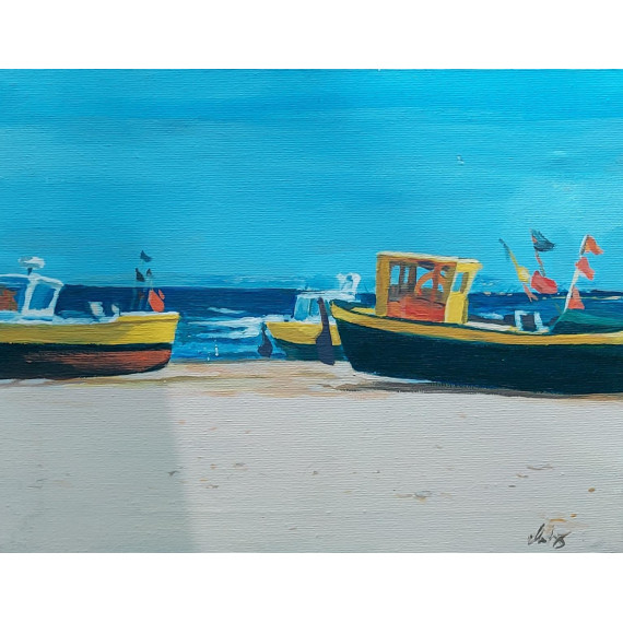 Artystka przenosi nas do urokliwego świata sopockiego brzegu za pomocą tego wyjątkowego obrazu o wymiarach 23×30 cm. Obraz przestawia malownicze łodzie, kotwiczące na spokojnym brzegu Morza Bałtyckiego. Ten pejzaż emanuje spokojem i subtelnością, jednocześnie oddając atmosferę Sopotu jako miejsca, gdzie historia spotyka się z urokiem nadmorskiego krajobrazu.
