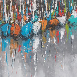Łodzie zostały namalowane w żywych kolorach, takich jak błękit, pomarańcz i czerwień, co dodaje kompozycji energii i dynamizmu. Refleksy na wodzie są delikatnie rozmyte, co tworzy wrażenie lekkiego ruchu fal i potęguje wieczorną atmosferę.