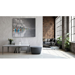 Obraz "Marina wieczorem" przedstawia malowniczy widok na marinę o zmroku. Dominują tu subtelne odcienie szarości, które oddają spokój i tajemniczość wieczornego pejzażu. Na pierwszym planie widać rzędy kolorowych łodzi zacumowanych w porcie, które kontrastują z monochromatycznym tłem miasta i spokojną wodą, odbijającą światła latarni i budynków.