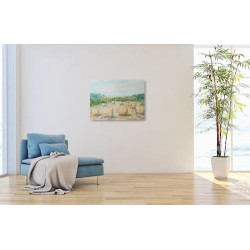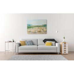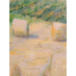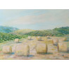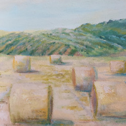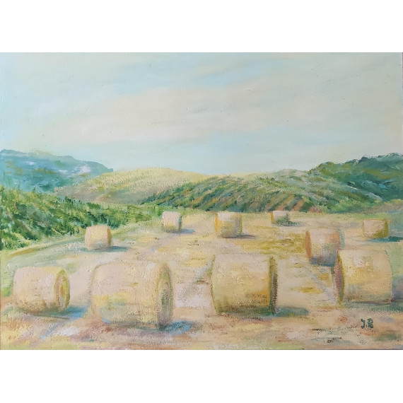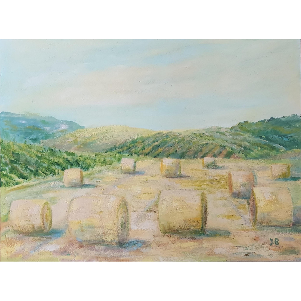 Obraz przedstawia idylliczny krajobraz Toskanii po żniwach. Na pierwszym planie widoczne są bale siana rozłożone na polu, a w tle rozciągają się łagodne wzgórza pokryte zielenią. Artysta użył delikatnych, pastelowych barw, aby oddać spokój i piękno toskańskiej wsi. Technika akrylu na płótnie pozwoliła na uzyskanie miękkich przejść kolorystycznych oraz subtelnej faktury, co dodaje głębi i realizmu całej kompozycji.