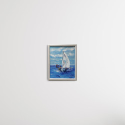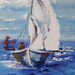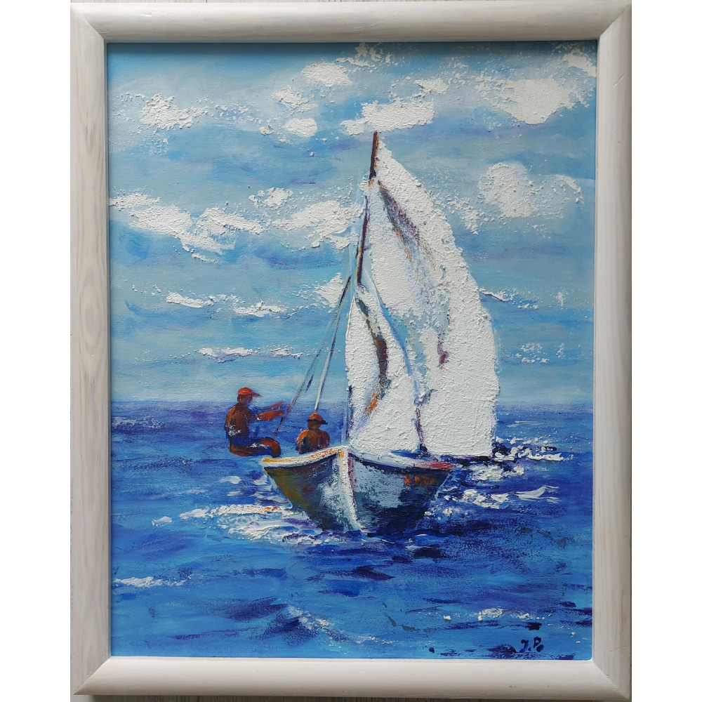 Ten dynamiczny obraz akrylowy przedstawia scenę żeglarską, gdzie dwaj żeglarze walczą z wiatrem i falami na otwartym morzu. Użycie żywych, kontrastujących kolorów dodaje kompozycji energii i ruchu. Błękitne tony wody i nieba tworzą harmonijną całość, a białe żagle stanowią centralny punkt obrazu, nadając mu lekkości i przestrzenności. Obraz emanuje atmosferą przygody i wolności, charakterystyczną dla żeglarskich wypraw.