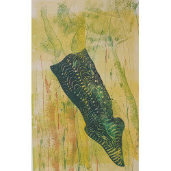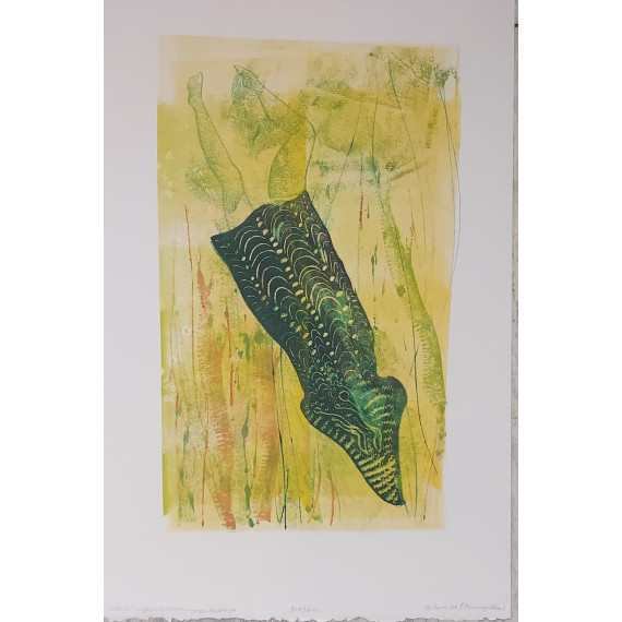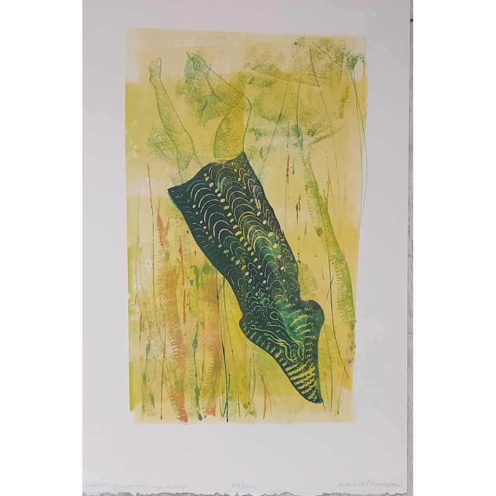 Przedstawiamy wyjątkową grafikę autorstwa Barbary Leszczyńskiej, który w niezwykły sposób łączy elementy natury i wyobraźni artystycznej. W centrum kompozycji znajduje się tajemnicza, mityczna postać w żywych, zielono-żółtych barwach, która zdaje się unosić w przestrzeni, otoczona abstrakcyjnym tłem pełnym organicznych kształtów i dynamicznych linii.