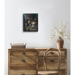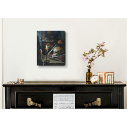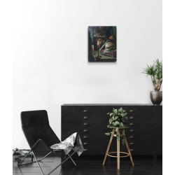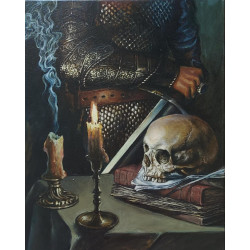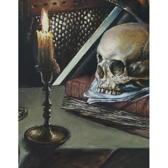 Obraz olejny inspirowany klasycznym motywem z tragedii "Hamlet" Williama Szekspira. Przedstawia on symboliczne elementy, takie jak czaszka, która jest nieodłącznym atrybutem głównego bohatera, oraz świecę, której płomień symbolizuje przemijanie i kruchość życia. Ciemna, dramatyczna kolorystyka i subtelne detale oddają głębię refleksji nad sensem życia i śmierci. Idealny wybór dla miłośników literatury, sztuki i filozofii.