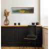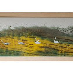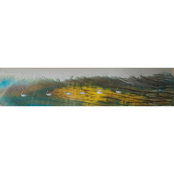 Ten wyjątkowy obraz autorstwa Klementyny Janusz przedstawia sześć łabędzi, które spokojnie płyną przez malowniczy krajobraz. Delikatne pociągnięcia pędzla i subtelne użycie kolorów, od chłodnych błękitów po ciepłe, złociste odcienie, tworzą harmonijną kompozycję, która oddaje atmosferę spokoju i podróży. Idealny do wnętrz, które potrzebują akcentu natury i spokoju.