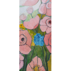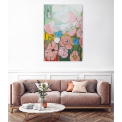 Kompozycja jest spokojna, lecz nie statyczna – kwiaty rozmieszczone są w sposób naturalny, przypominający dziki, bujny ogród. Mimo swojej abstrakcyjności, obraz emanuje harmonią i naturalnym pięknem, dając wrażenie miejsca pełnego życia, ciszy i spokoju.