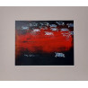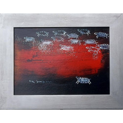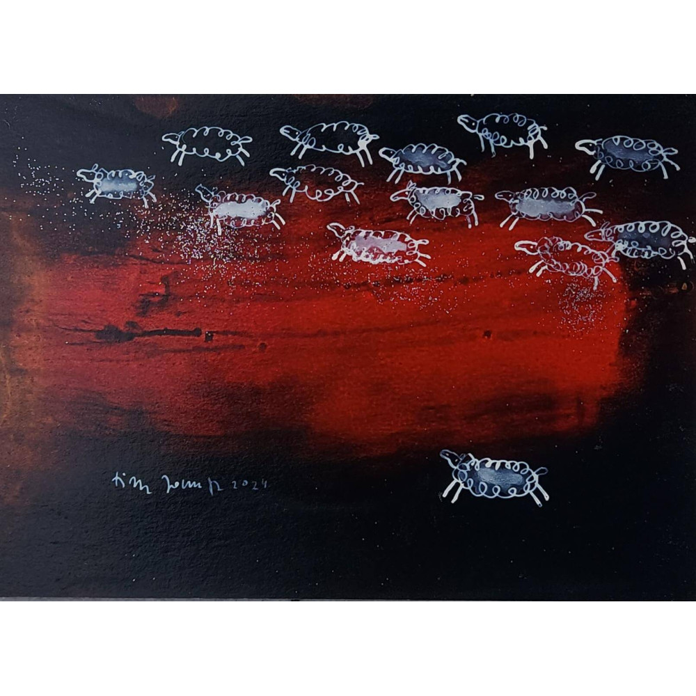 Ten unikalny gwasz z 2024 roku przyciąga uwagę wyrazistą, intensywnie czerwono-czarną kolorystyką, która stanowi tło dla delikatnych, szkicowych przedstawień zwierząt. Artysta zbudował swoją kompozycję wokół kontrastów – gładkich pociągnięć pędzla i subtelnych, niemal eterycznych kształtów zwierząt wykonanych białą linią. Centralny motyw stanowią małe, stylizowane zwierzęta przypominające owce lub inne postacie, które sprawiają wrażenie jakby były częścią wirującej mgły lub tłumu unoszącego się nad powierzchnią płótna.