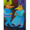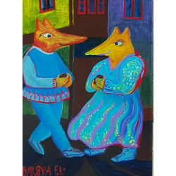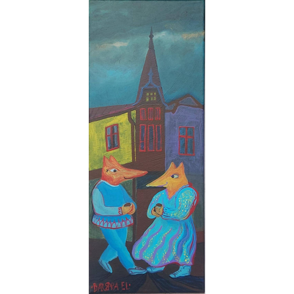 W obrazie „Kawa pod Domem Wójta Radtkego w Gdyni” artystka uchwyciła codzienną scenę spotkania dwojga osób, których sylwetki zostały przedstawione w nieco stylizowany sposób przypominający zwierzęta. Intensywne kolory oraz zastosowanie ekspresyjnych technik malarskich tworzą intrygujący kontrast, a całość emanuje ciepłem i serdecznością.