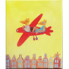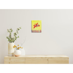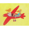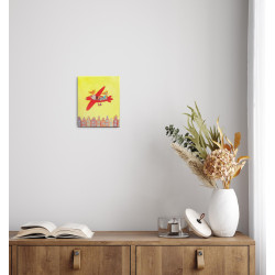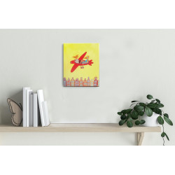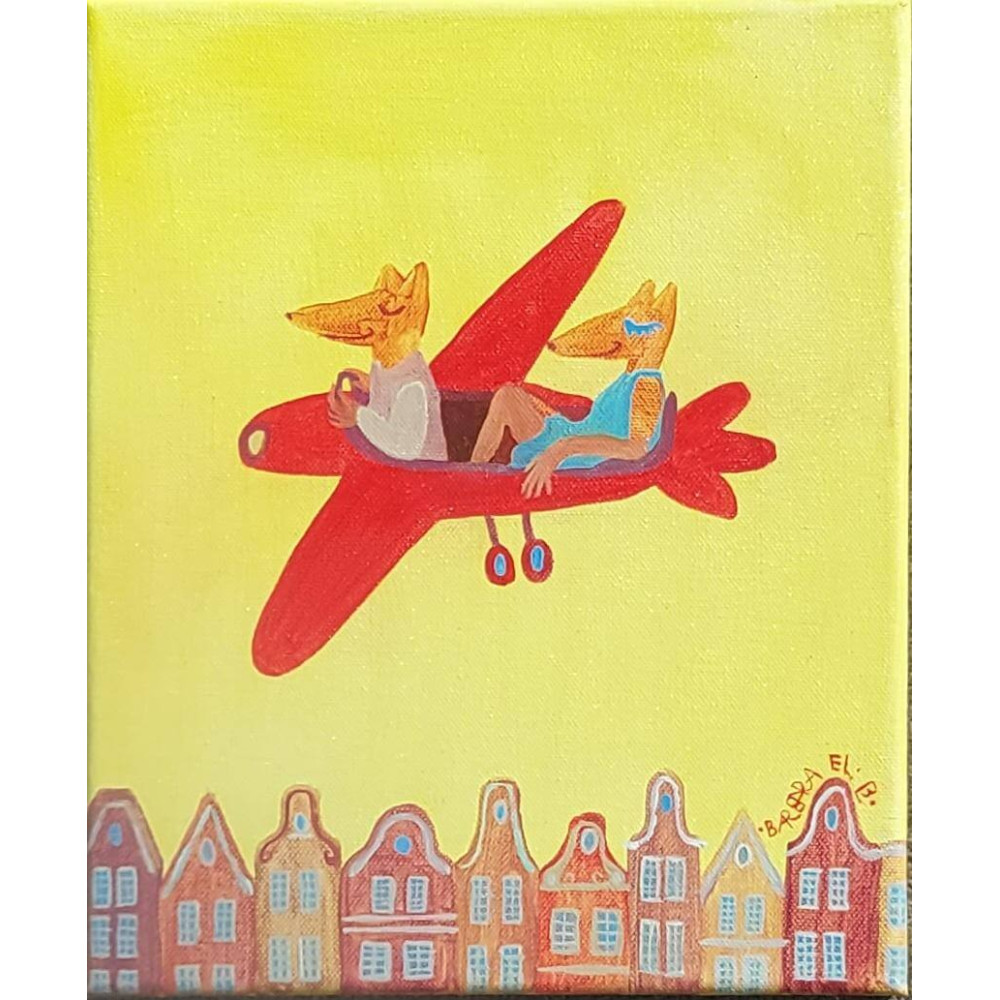 Na obrazie Barbary Leszczyńskiej widzimy dwie antropomorficzne postacie przypominające lisy, lecące czerwonym, stylizowanym samolotem nad rzędem kolorowych, bajkowych kamienic. Postacie są w swobodnych pozycjach, co nadaje kompozycji lekkości i humoru. Tło obrazu jest intensywnie żółte, co podkreśla wesoły, niemal dziecięcy charakter sceny. Obraz łączy elementy surrealizmu z figuratywną sztuką, tworząc nieco absurdalną, ale pełną radości wizję podróży nad miastem. Jasne kolory, uproszczone formy i zaskakujące zestawienie postaci sprawiają, że obraz jest pełen pozytywnej energii i lekkości.