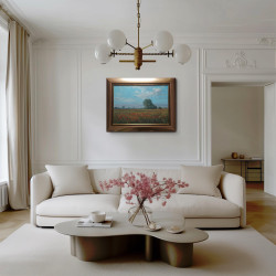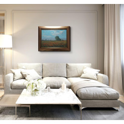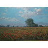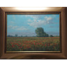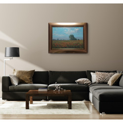 Maki na Żuławach" to pejzaż autorstwa Wojciecha Góreckiego, przedstawiający urzekającą naturę Żuław z makami w roli głównej. Scena została uchwycona w plenerze, co podkreśla autentyczność i żywość kolorów polskiego krajobrazu. Obraz ukazuje szeroki, płaski teren z czerwonymi makami na tle błękitnego nieba, przyciągając wzrok bogactwem detali. Dzieło, o wymiarach całkowitych 70x89 cm, jest oprawione w elegancką, złotą ramę, która dodaje mu klasycznego charakteru