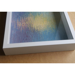 Akryl na płycie o wymiarach 38x52 cm, oprawiony w wąską granatową ramę i kremowe passe partout.