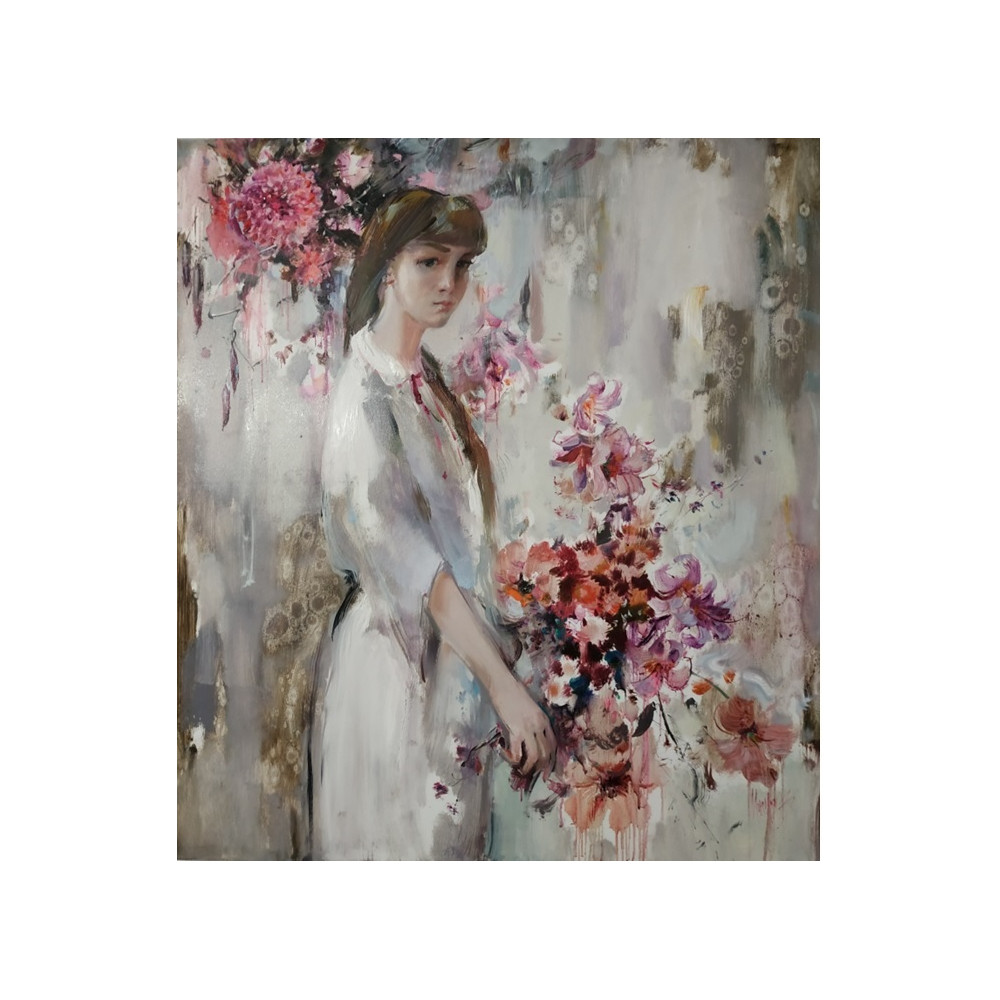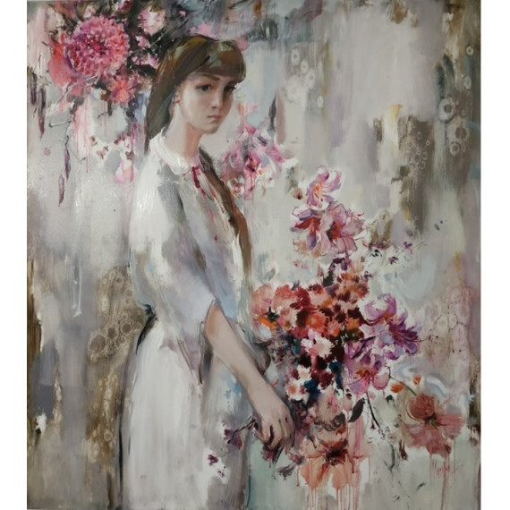 "Bloom" to fascynujący obraz, który przenosi widza w mistyczną przestrzeń, gdzie kobiecość splata się z pięknem kwiatów. Olej na płótnie o wymiarach 100 x 90 cm artystka uwiecznił delikatną, ale silną postać kobiety otoczoną płatkami kwiatów w różnorodnych odcieniach. Praca powstała podczas zeszłorocznego pleneru w Sopocie i stała się kontynuacją cyklu prac pt. "Kwiaty, Ptaki i Trochę Miłości". Naturalne piękno kobiety porównałam do kwiatów, które zawsze były uważane za jeden z największych i najpiękniejszych darów Boga.