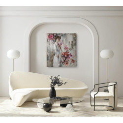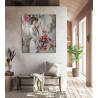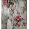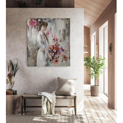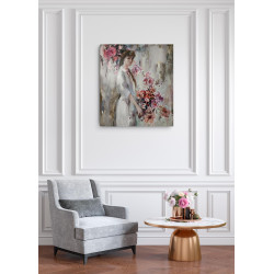 Kobieta na obrazie emanuje spokojem i siłą jednocześnie. Jej postać jest otoczona delikatnymi płatkami, które zdają się tańczyć wokół niej, tworząc aurę wyjątkowej harmonii. Wyraziste odcienie zieleni, fioletów i róż różnorodnych kwiatów nadają obrazowi dynamiki i głębi.