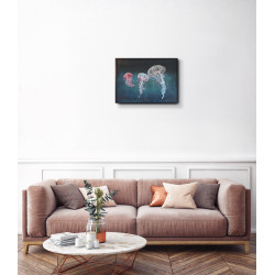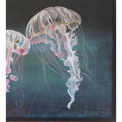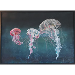 Ręcznie malowany obraz przedstawiający "Meduzy", wykonany techniką akrylową na płycie o wymiarach 50x70 cm. Unikalna kompozycja morskich stworzeń na tle głębokiej zieleni. Dzieło charakteryzuje się precyzyjnym detalem i subtelną paletą barw, które oddają piękno podwodnego świata. Idealnie komponuje się w nowoczesnych i klasycznych wnętrzach, dodając im elegancji i artystycznego wyrazu. To doskonały pomysł na prezent dla miłośników morskiej tematyki i sztuki współczesnej.