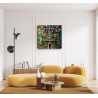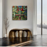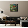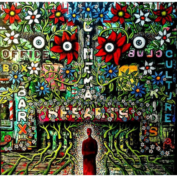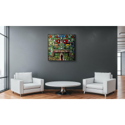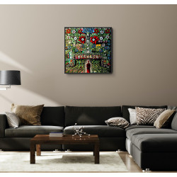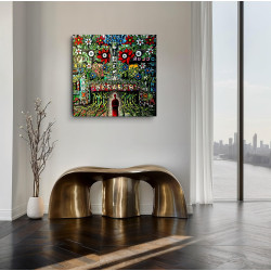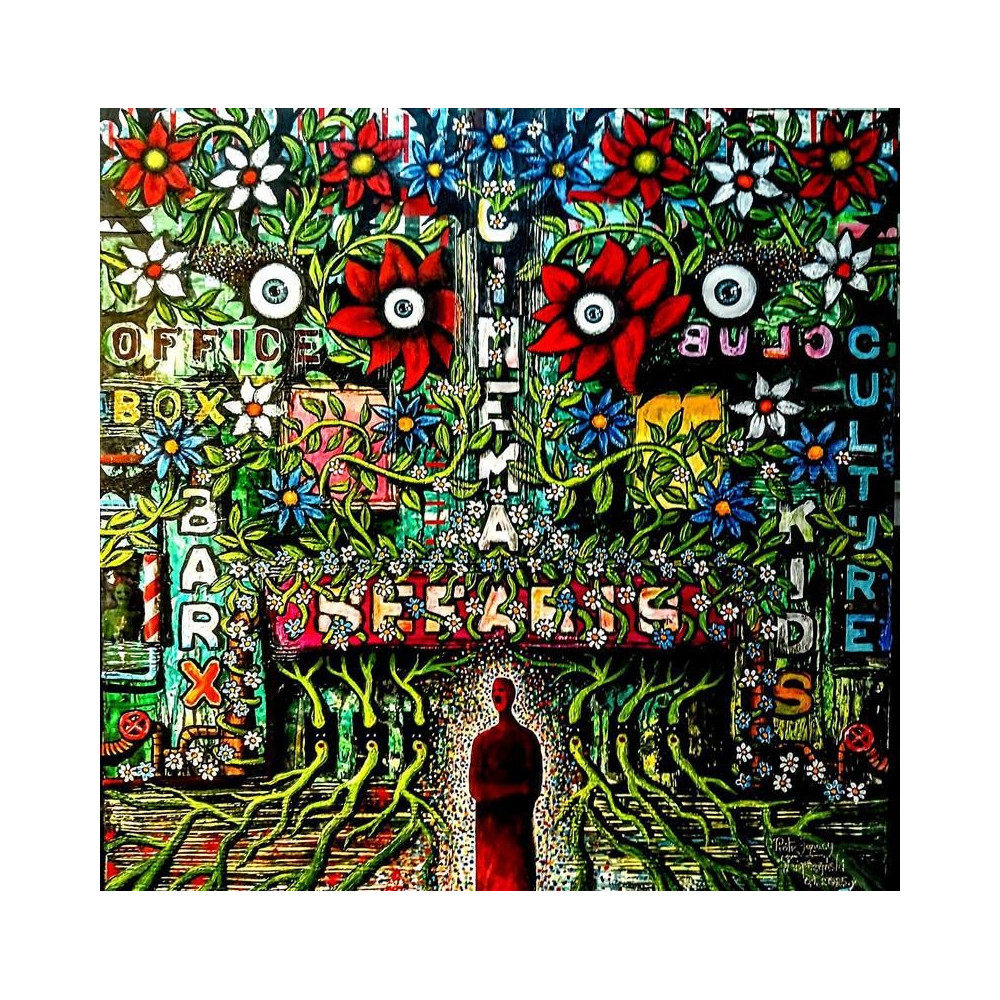 Pełen ekspresji i symboliki obraz autorstwa Piotra Ignacego Kopczyńskiego to unikalna kompozycja akrylu na płótnie o wymiarach 90x90 cm. Artysta wyraża swoje emocje, wizje oraz przemyślenia poprzez bogactwo barw, kształtów i tekstur. Centralnym punktem jest postać ludzka otoczona bujną roślinnością oraz napisami, które wchodzą w dialog z widzem, tworząc złożoną narrację na temat kultury, natury i współczesnego świata. Obraz ten jest nie tylko dziełem sztuki, ale również zaproszeniem do refleksji nad ludzkimi uczuciami, życiem, relacjami oraz społeczeństwem.