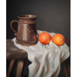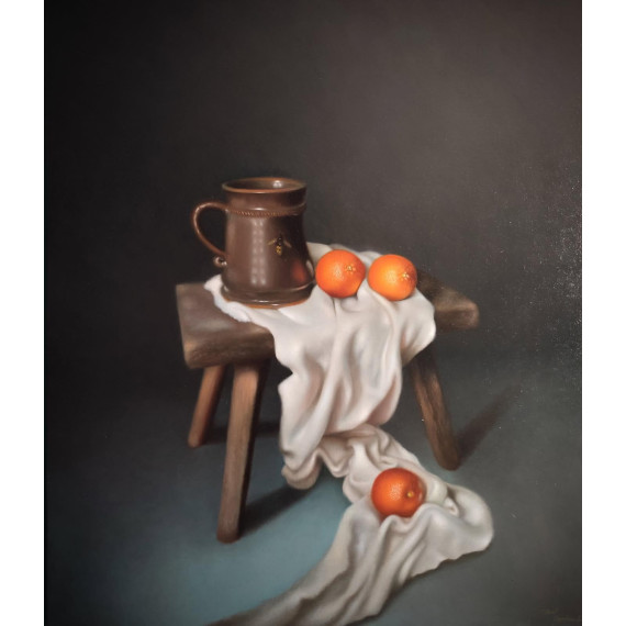 Dzięki zastosowaniu profesjonalnych farb olejnych Schmincke i Rembrandt, obraz cechuje się głębią kolorów oraz realistycznym oddaniem detali. Precyzyjna gra światłocienia podkreśla miękką fakturę tkaniny, szlachetną ceramikę dzbanka i soczystość pomarańczy, tworząc harmonijną i wyważoną kompozycję. Delikatnie uchwycona pszczoła na powierzchni naczynia dodaje dziełu symbolicznego charakteru i podkreśla harmonię natury.