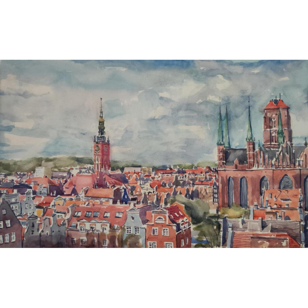 Zachwycająca akwarela przedstawiająca Panoramę Gdańska, uchwyconą w niezwykle subtelny i pełen detali sposób. Artur Bełczykowski oddaje klimat historycznego miasta z jego charakterystycznymi budowlami, w tym monumentalnym Kościołem Mariackim i urokliwymi kamienicami Miasta.