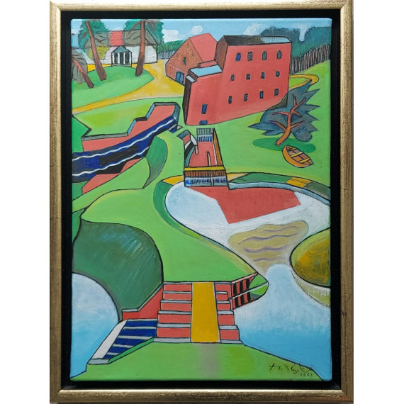 Akryl na płótnie oprawiony w passe-partout i ramę szerokości 10cm.