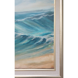 Praca oprawiona w prostą z dystansem do płótna ramę, o kolorze szampańskiego złota.