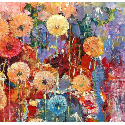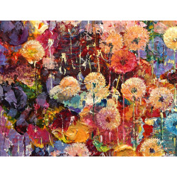 Malarska interpretacja dmuchawców w stylu ekspresyjno-abstrakcyjnym. Obraz przyciąga bogactwem kolorów, fakturą i dynamiczną kompozycją, oddając wrażenie ulotnego piękna natury.