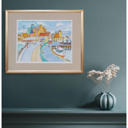 Akwarela oprawiona jest passe-partout i złotą wąska ramę o szerokości 2cm.
