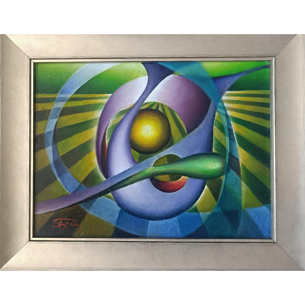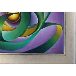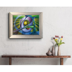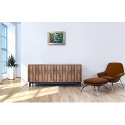 Praca oprawiona w prostą drewnianą ramę w kolorze połyskującej szarości o szerokości 4cm. Wymiary caŁkowite 27×35cm