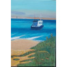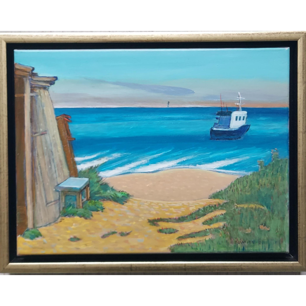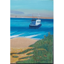 Motyw marynistyczny nieco inaczej; jachty podczas regat i wzburzone morze. Technika wykonania: olej na płótnie. Wymiary: 90x70 cm. Rama drewniana, surowa, o szerokości 6cm.