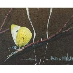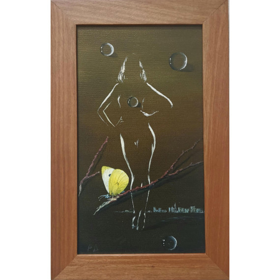 Ten niezwykle symboliczny obraz autorstwa litewskiego artysty Dirgela Povilasa przedstawia subtelnie zarysowaną kobiecą sylwetkę, której kontury kontrastują z ciemnym tłem. Delikatny żółty motyl osiadający na gałęzi symbolizuje lekkość, wolność oraz ulotność piękna. Kompozycję dopełniają realistycznie namalowane szklane bańki i cień miejskiego krajobrazu na horyzoncie, nadając dziełu wymiar surrealistyczny.