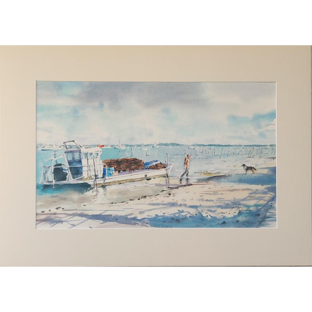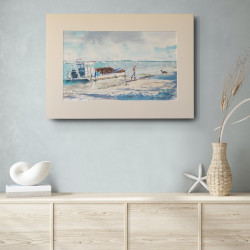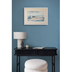 Technika Akwarela oprawiona w passe-partout oraz delikatną białą ramkę.