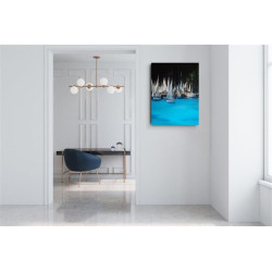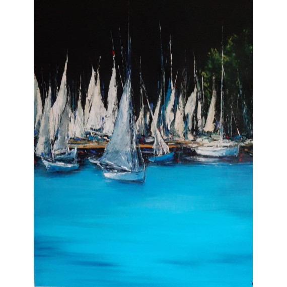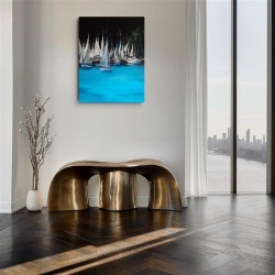 „Przystań” Kingi Żórańskiej to nowoczesny obraz marynistyczny z żaglówkami, namalowany akrylem na płótnie (80x100 cm). Nastrojowa kompozycja w odcieniach błękitu i bieli wprowadza do wnętrza spokój, światło i elegancję – idealna jako obraz do salonu lub gabinetu.