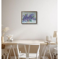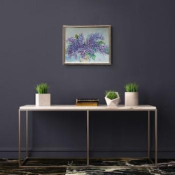 Krajobraz w odcieniach niebieskiego i fioletu. Obraz olejny na płótnie o wymiarach 80x80 cm, oprawiony w wąską drewnianą ramę pomalowaną na kolor brązowy.
